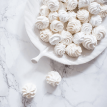 Do 4 bielkov pridáme 40 g kokosového cukru. Pridáme štipku soli, vymiešame do hustej peny a hmotu striekame na papier na pečenie. Sušíme pri 50 °C.