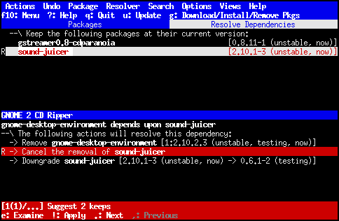 If you do not resolve any broken dependencies, aptitude will automatically implement its current suggestion when you commit your selections by pressing g. However, it is hard to automatically solve dependency problems, and you may not be happy with the results, so it is generally better to look at what aptitude plans to do before committing your selections. |